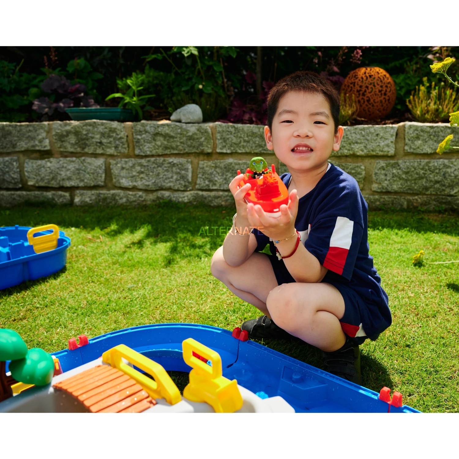 Mit der Wasserbahn AquaPlay AdventureLand kommt echtes Abenteuerfeeling in den heimischen Garten. Das große Spielset enthält neben vielem anderen einen großen Berg mit Turm und Stausee und zwei Boote mit Tierfiguren, den Frosch „Nils“ und dem Bären „Bo“. Gemeinsam mit den beiden Freunden können die Kinder Höhlen und Wasserfälle durchqueren, die wilde Wasserrutsche hinunterfahren, den Bergsee befüllen und wieder ablassen und wertvolle Schätze verstecken und suchen. Beim Spiel lernen Kinder das Element Wasser kennen und sehen, wie Strömungen entstehen und sich deren Richtung ändern lässt. Im Grashügel, in dem sich auch eine Höhle mit zwei Eingängen befindet, ist außerdem ein Geheimversteck unter beweglichen Steinen, in dem die kleinen Schätze der Kinder gut aufgehoben sind, zu finden. Auf den großen Turm gelangen die Boote mithilfe eines Aufzugs und dann geht es die wilde Wasserrutsche hinunter! Außerdem kann über eine Luke im Turm der Bergsee befüllt werden. Wird die Schleuse des Bergsees geöffnet, bildet sich darunter je nach Wasserstand entweder ein wilder Wasserfall oder ein sanfter Regenvorhang, durch den die Boote fahren, nachdem sie aus der großen Wasserhöhle kommen. Die nötige Strömung und die richtige Fahrtrichtung können die kleinen Spieler durch die leicht zu drehende Handkurbel mit großen Schaufelflächen bestimmen. Die Wasserstraßen und die liebevollen Details des Spielsets sorgen für langes Spielvergnügen. Das Spielset AquaPlay AdventureLand ist für Kinder ab drei Jahren geeignet.