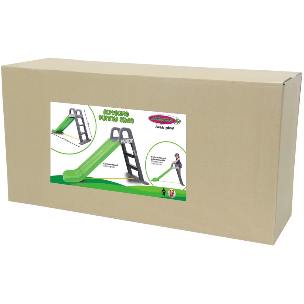 Mit der „Funny Slide“ Fendt-Kinderrutsche ermöglicht JAMARA ein Rutschvergnügen auch schon für die ganz Kleinen ab einem Jahr. Durch die leichte Montage der farbenfrohen Rutsche lässt sie sich im Handumdrehen aufbauen. Mit knapp vier Kilo ist die offiziell lizensierte Fendt-Rutsche ein Leichtgewicht und einfach zu transportieren, trotzdem robust und hält mit der breiten Stufenleiter auch wilden Spielen stand. Oben auf der Leiter angekommen sorgen große Sicherheitsgriffe für festen Halt und der große Rutschauslauf sorgt für weiche und sichere Landungen. Ein Stabilisierungsseil in der Mitte der Rutsche gibt zusätzliche Sicherheit und somit steht dem Rutschvergnügen In- oder Outdoor nichts mehr in Wege.