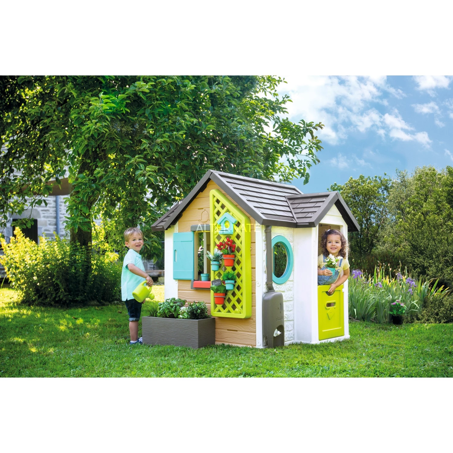 | Inhalt/Ausstattung | Spielhaus, mit, 2, Fenstern, mit, Klappläden, halber, Eingangstür, 2, Bullaugen-Fenstern, Spalier, Gärtnerwerkzeug, 6, Blumentöpfe, Vogelhaus, abnehmbarer, Arbeitstisch, Regenfass, mit, Gießkanne, Pflanzgefäß |