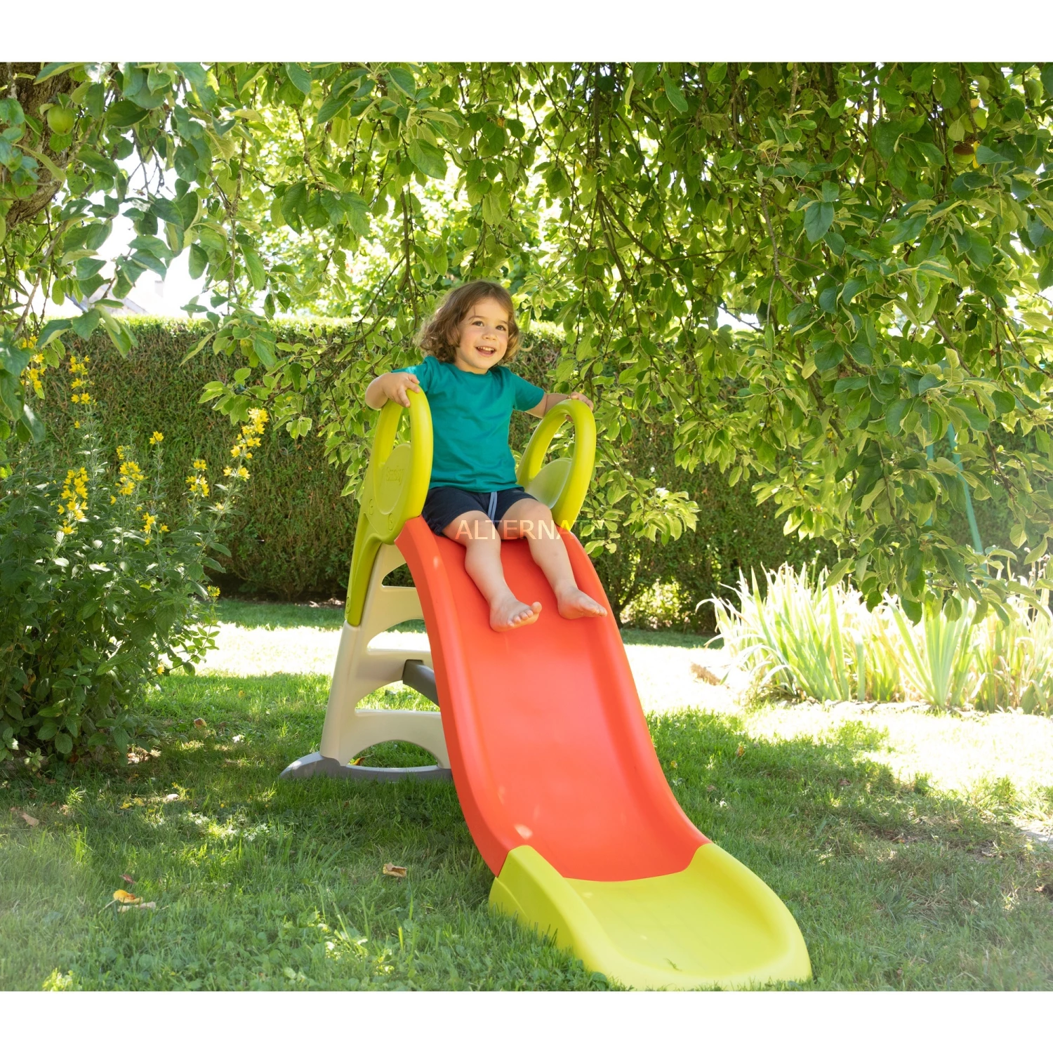 Die KS Rutsche von Smoby: Rutschspaß auch an heißen Sommertagen! Die KS Rutsche von Smoby besticht nicht nur durch ihr farbenfrohes Design und ihre 150 cm Rutschlänge, sie hat auch noch ein ganz besonderes Extra: sie verfügt über einen Wasseranschluss für einen Gartenschlauch und verwandelt sich so im Handumdrehen in eine Wasserrutsche. Der breite Rutschauslauf sorgt für weiche Landungen. Die Leiter ist mit dem Geländer, dem breiten Standfuß und dem Anti-Rutsch-Treppenstufen besonders sicher und stabil. Die Rutsche kann kinderleicht zu ihrer Gesamtgröße (Gesamtlänge: 159 cm, Höhe: 100 cm, Breite: 68 cm) montiert werden. Zum praktischen Verstauen lässt sie sich genauso schnell und einfach demontieren. Die Rutsche überzeugt nicht zuletzt durch den UV-stabilen Kunststoff, der besonders widerstandsfähig gegen Wettereinflüsse und Ausbleichung ist. Wie alle Smoby-Produkte entspricht sie den neuesten Anforderungen an die Produktsicherheit.