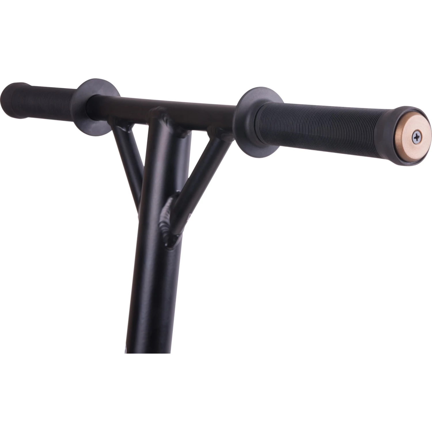 Der Stuntscooter XR-25 eignet sich für coole Moves und Free-Style-Tricks. Er ist ein Rollsportgerät aus hochwertigem T6 Aluminium mit Hinterrad-Flex-Reibungsbremse. Zur exklusiven Ausstattung gehören der verstärkte 52er Lenker, die robusten Gummigriffe mit Kappen sowie die Felgen und der extrudierte down tube aus hochwertigem Aluminium. Große Wendigkeit durch Original-Neco-Steuerungssatz mit extrem starker 360°-Lenkung. Des Weiteren High-Rebound-Rollen aus gegossenem PU, 88 A, Ø 100 mm. Kugellager ABEC 7, Chrom. Der Scooter bietet eine maximale Belastbarkeit von 100 kg.