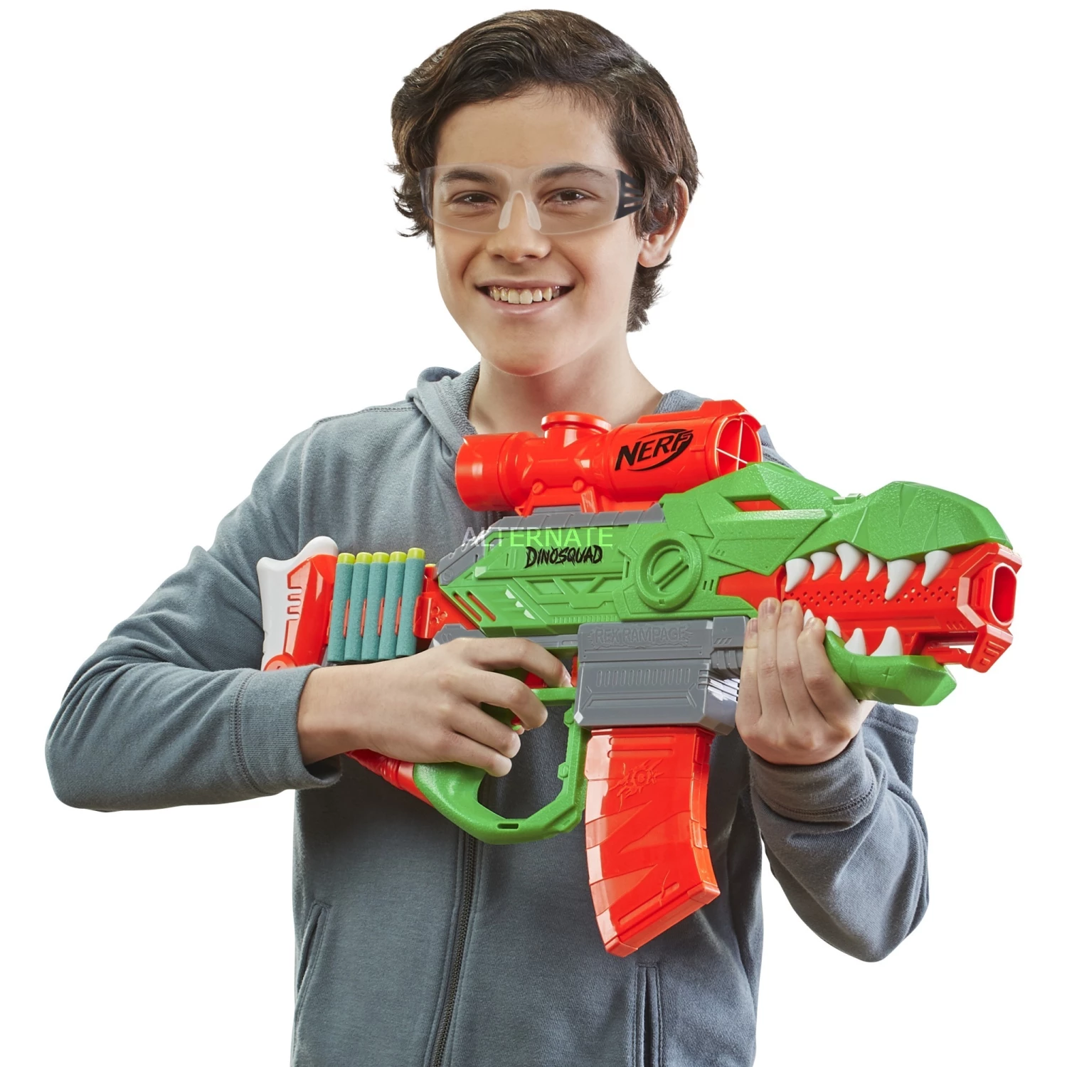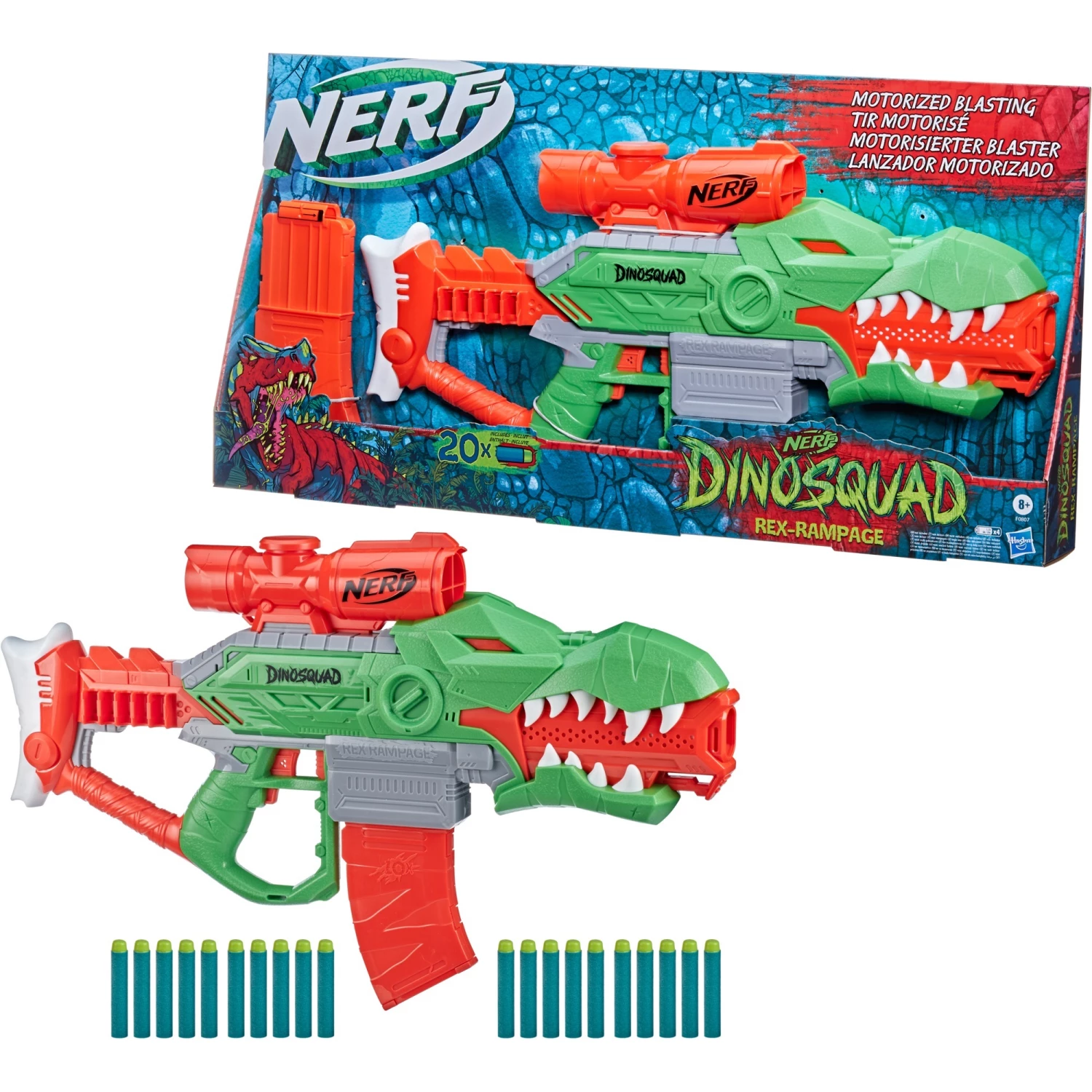 Als Mitglied der Elitetruppe DinoSquad verbünden sich Nerf Fans mit legendären Sauriern. Hier kann die außergewöhnliche Kraft der großartigsten Dinosaurier entfesselt werden, um sich in actionreiche Abenteuer zu stürzen. Mit dem Nerf DinoSquad Rex-Rampage Blaster kann das Battle mit der Power eines T-Rex starten! Er präsentiert saurierstarke Details und fängt den Look eines Tyrannosaurus Rex perfekt ein. Einfach den Motor hochpowern und den Abzug drücken, um die Darts schnell abzufeuern. Er kommt mit einem 10-Dart Clip-Magazin, sodass 10 Darts in Folge dem Ziel entgegengeschickt werden können. Der Blaster verfügt über eine integrierte Dart-Aufbewahrung für 10 Darts, um sie für schnelles Nachladen in Reichweite zu haben. Ebenfalls enthalten ist ein fest angebrachtes und nicht abnehmbares Zielfernrohr, um den Schuss zielgenau auszurichten. Er kommt mit 20 Nerf Elite Darts, die auf Leistung und Qualität getestet wurden.