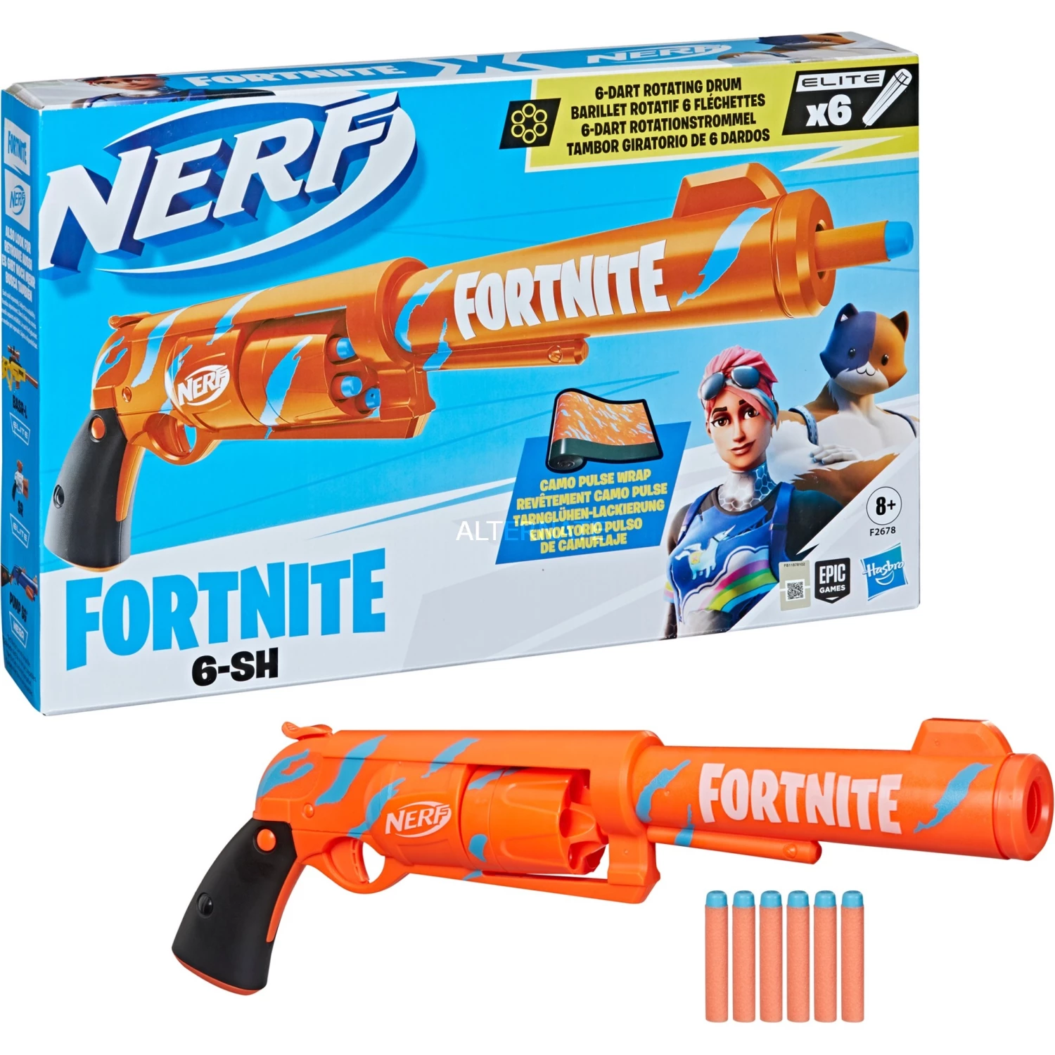 Der Nerf Fortnite 6-SH Blaster ist durch die im Fortnite Videospiel verwendete Ausrüstung inspiriert und hat den Look der Camo Pulse Lackierung aus dem beliebten Videospiel. Der Blaster kommt mit Revolver-Action – durch das Herunterziehen des Spannhebels wird der Blaster auf das Feuern vorbereitet, anschließend wird der Abzug gedrückt, um einen Dart abzufeuern. Dieser Nerf Fortnite Blaster enthält 6 Nerf Elite Darts, genug, um die 6-Dart Rotationstrommel vollständig zu laden.