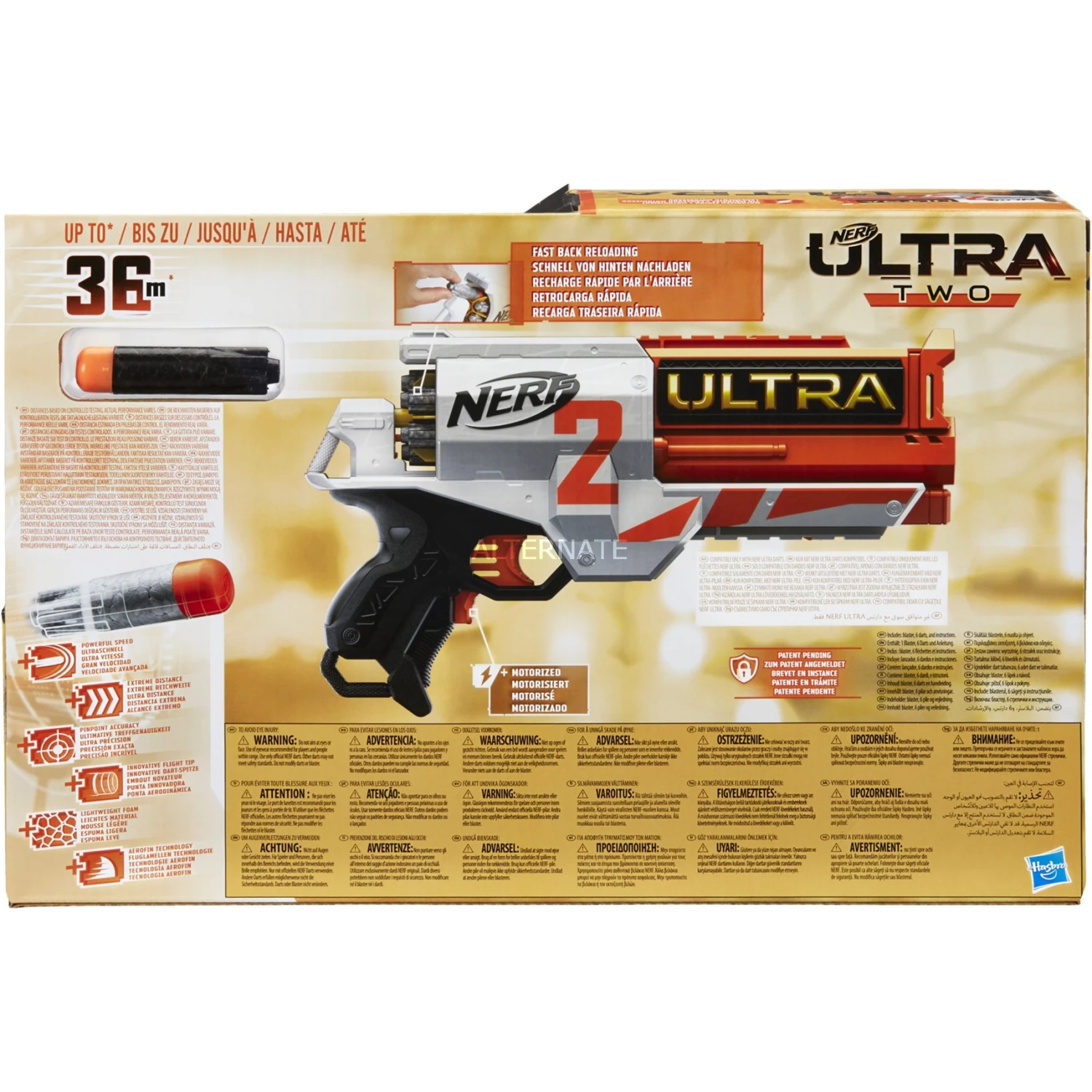 Das Nonplusultra beim Abfeuern von Nerf Darts. Nerf Ultra Blaster haben ein weiterentwickeltes Design und eine verbesserte Leistung für mehr Reichweite, Treffgenauigkeit und Geschwindigkeit. Sie umfassen bahnbrechende Nerf Ultra Darts – die am weitesten fliegenden Nerf Darts ALLER ZEITEN, mit innovativer Dart-Spitze, Fluglamellen Technologie und Nerf Ultra Schaum. Nerf Ultra Blaster funktionieren nur mit Nerf Ultra Darts. Der motorisierte Nerf Ultra Two Blaster kann schnell von hinten nachgeladen werden. Die 6-Dart Trommel ist hinten offen – der Spieler kann sehen, wie viele Darts übrig sind und wann es Zeit zum Nachladen ist. Um 1 Dart abzufeuern, wird der Beschleunigungs-Knopf gedrückt, um den Motor hochzupowern und der Abzug betätigt. Enthält 6 Nerf Ultra Darts, die nur mit Nerf Ultra Blastern kompatibel sind. Die Darts fliegen bis zu 36 Meter weit. Nerf Ultra Blaster und Darts heben das Spiel auf die nächste Ebene.