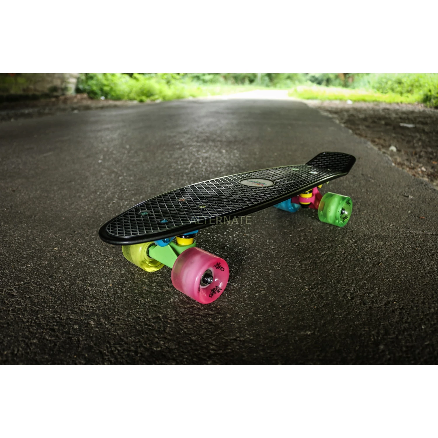 | Inhalt/Ausstattung | Skateboard, mit, Leuchtrollen, PP-Deck, Aluminiumachse, gegossene, PU, Rollen, Rollengröße:, 60, x, 45, mm, Kugellager, ABEC, 5. |