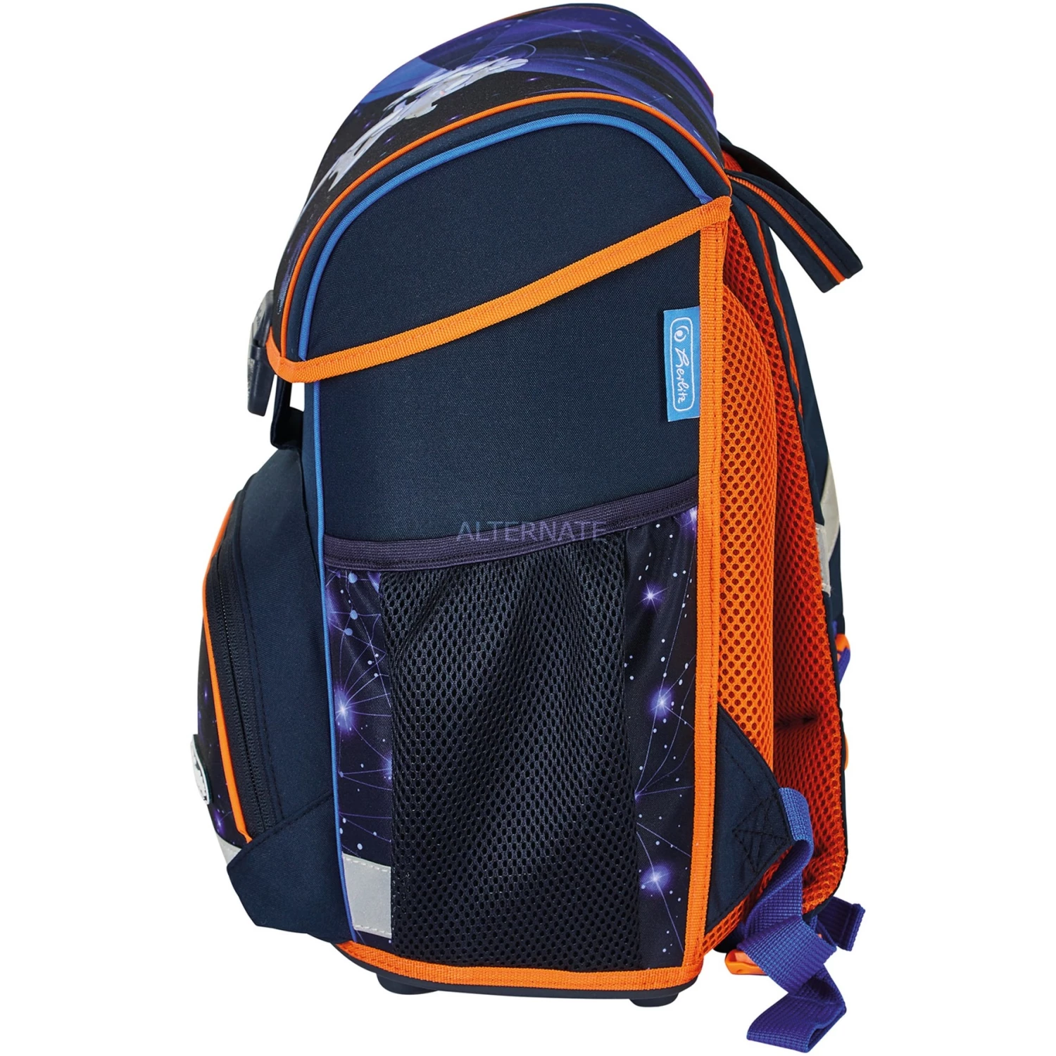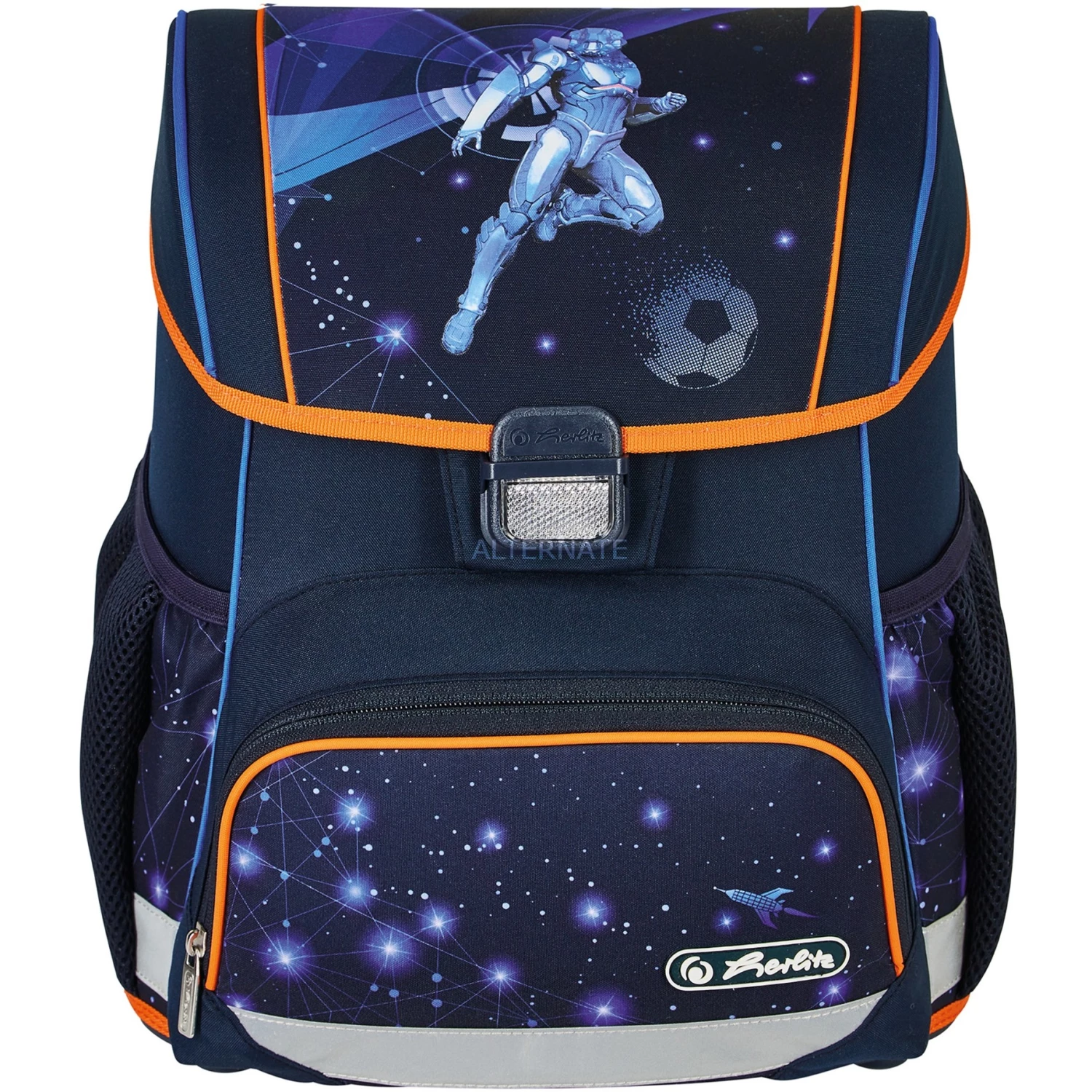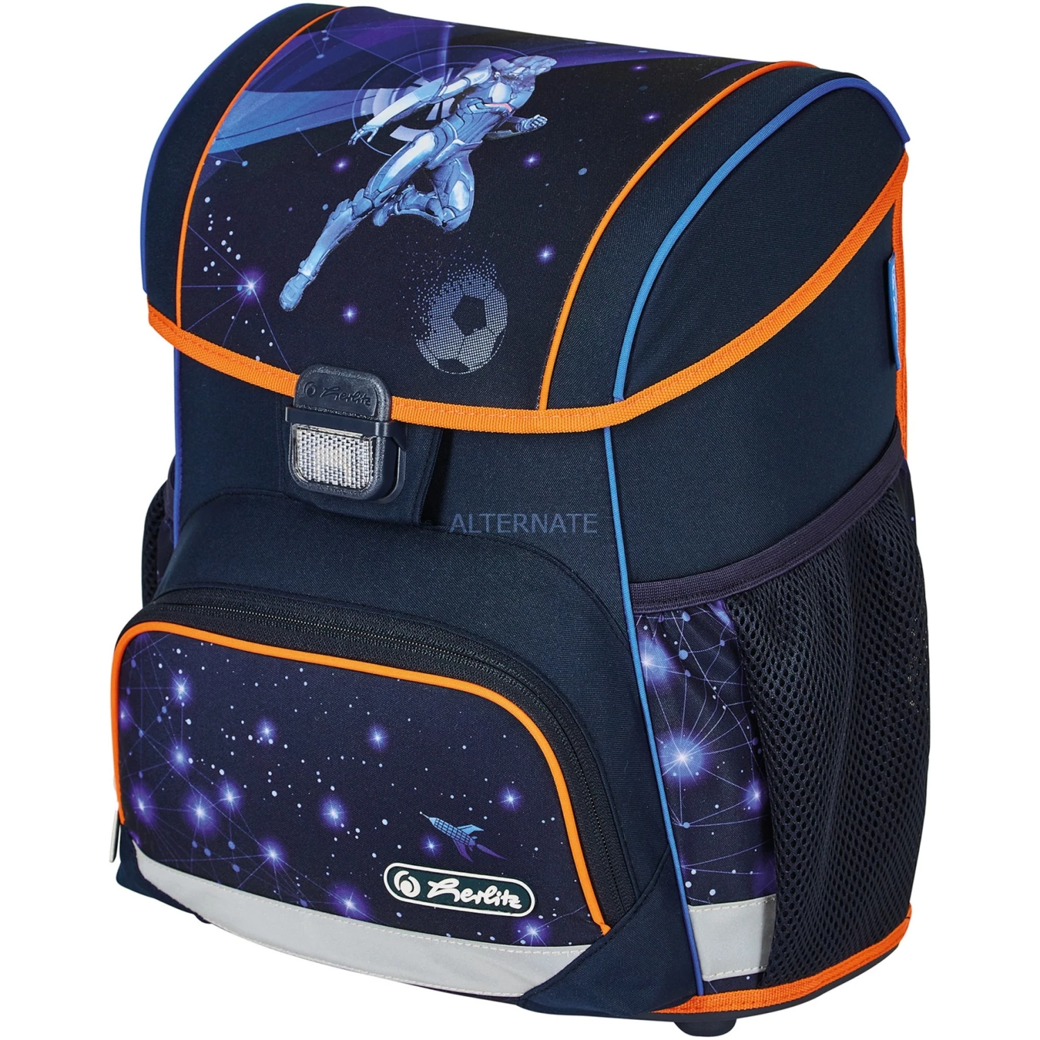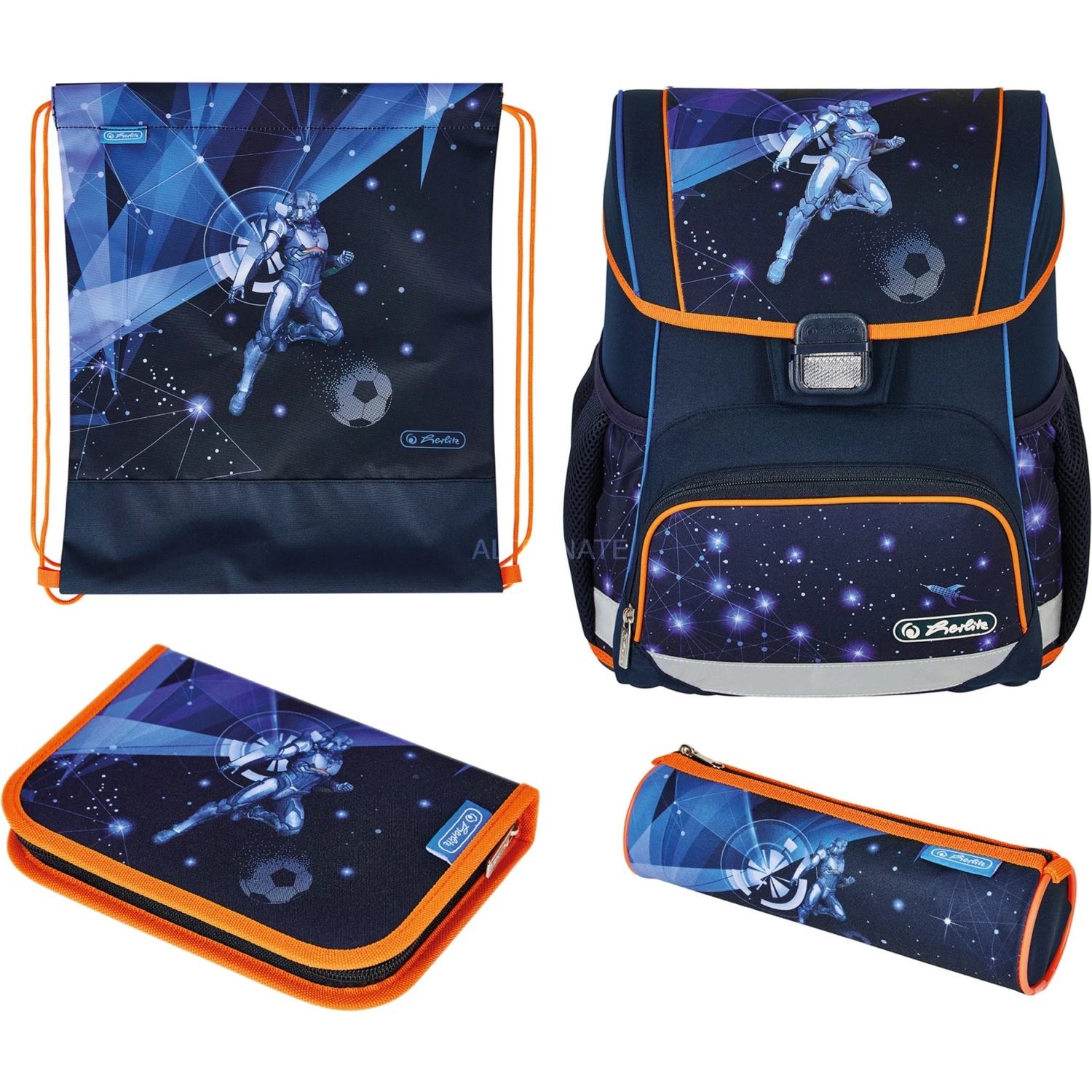 Schulbedarf Herlitz Loop Plus Galaxy Game, Schulranzen (dunkelblau/orange, Inkl. 16 Tlg. Schüleretui, Faulenzermäppchen, Sportbeutel)