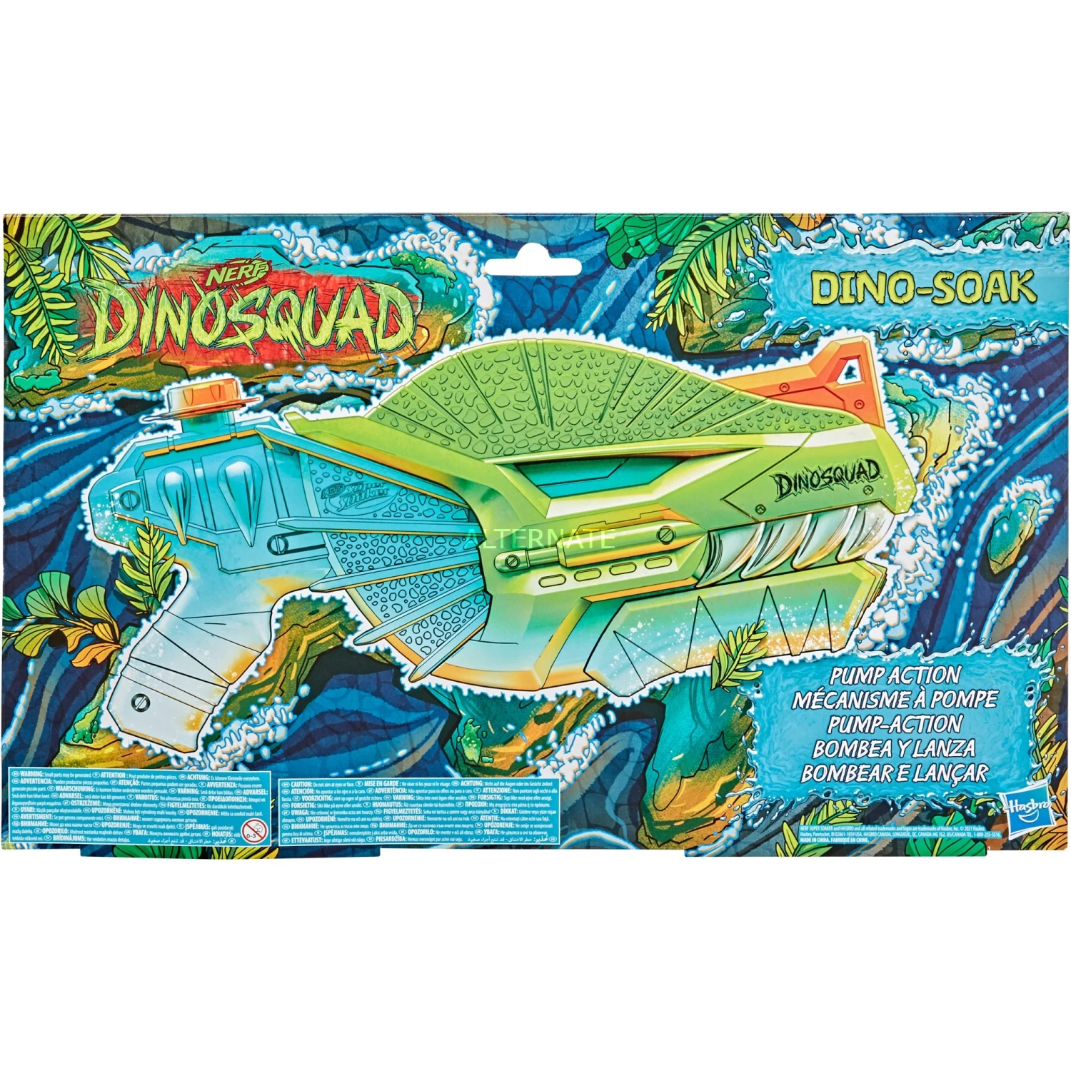 Als Mitglied der Elitetruppe DinoSquad verbünden sich Nerf Fans mit legendären Sauriern. Hier kann die außergewöhnliche Kraft der großartigsten Dinosaurier entfesselt werden, um sich in actionreiche Abenteuer zu stürzen. Hier werden die Mitspieler richtig nass gemacht – mit dem DinoSquad Dino-Soak Wasserblaster! Dieser Nerf Super Soaker Blaster kommt im Look eines Dilophosaurus und sorgt für wilde Wasser-Action. Einfach das Ziel anvisieren und aus dem Maul das Wasser abfeuern, um die Mitspieler zu erwischen. Er eignet sich prima für Spiele im Freien, Wasser-Battles im Garten und bietet jede Menge Spaß im Sommer. Er ist toll für Kinder und Erwachsene und der ideale Begleiter für Saurierfans. Er kann leicht befüllt und abgefeuert werden: Einfach den Deckel öffnen und den Tank mit Wasser füllen, dann den Deckel schließen und den Pump-Griff vor und zurück bewegen, um einen dinotastischen Wasserstrahl abzufeuern!