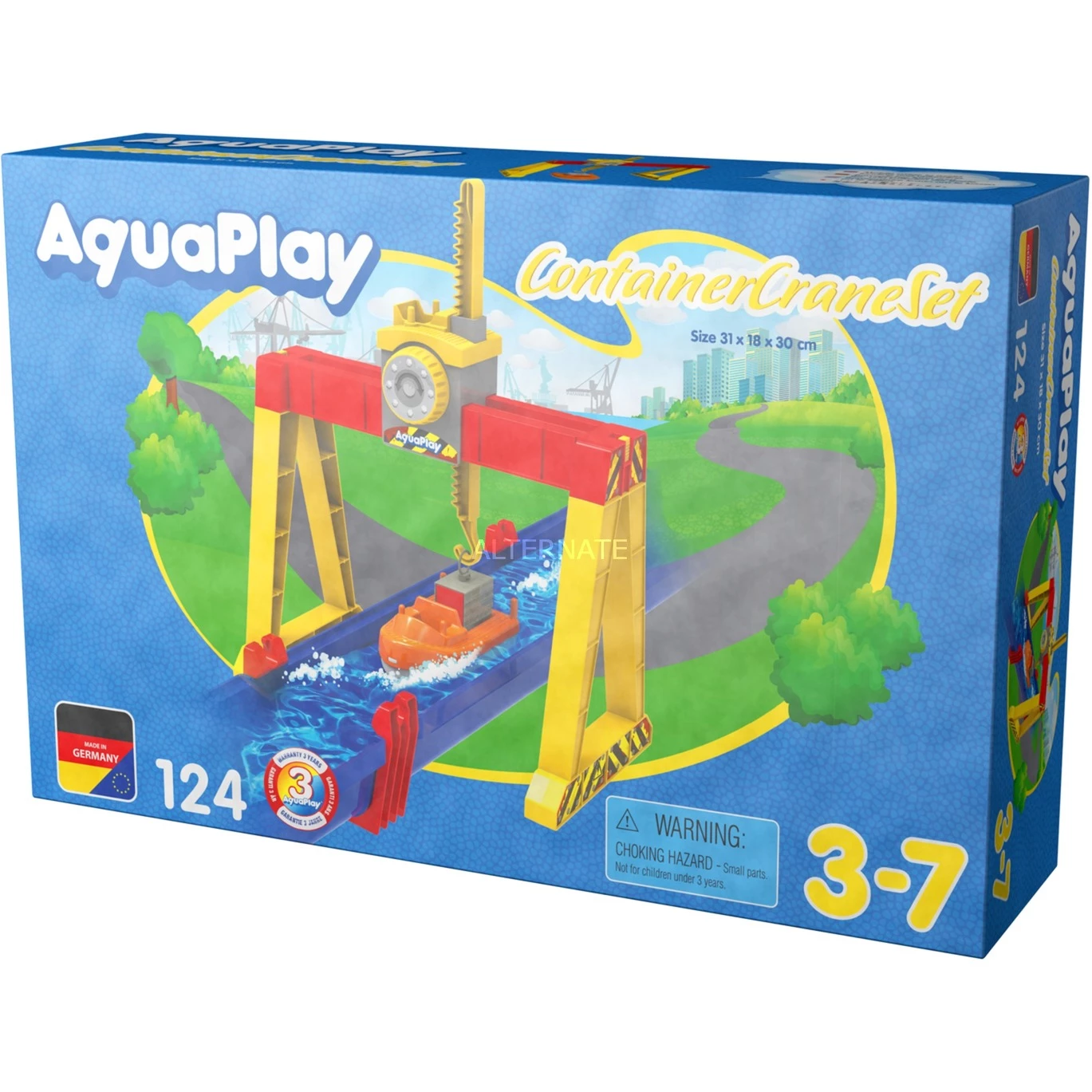 Das AquaPlay ContainerCraneSet ist die ideale Ergänzung zu allen AquaPlay Systemwasserbahnen. Das Zubehörset besteht aus einem großen Portalkran und einem Containerboot mit Container. Dabei ist die Länge genau auf die Breite einer Kanalgeraden oder einer Kanalkurve abgestimmt. Im Spiel lernen Kinder ab drei Jahren das Bedienen eines Kranarmes und wie mit Hilfe eines Drehrades Container bewegt werden können. Wird das Kranhäuschen geschoben, bewegt sich der Container zum Entladen über die gesamte Länge des Kranes von einer Seite zur anderen. Das AquaPlay ContainerCraneSet wird in Deutschland aus hochwertigem UV-beständigen Kunststoff hergestellt. Jeder Packung liegt eine leicht verständliche Aufbauanleitung bei.